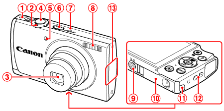 ![]() | 快門按鈕 | ![]() | 直流電連接器連接線連接埠 |