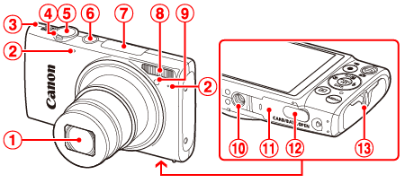 ![]() | 變焦桿 拍攝:< (遠攝)>/< (廣角)> 播放︰< (放大)>/< (索引)> | ![]() | 記憶卡/電池蓋 |