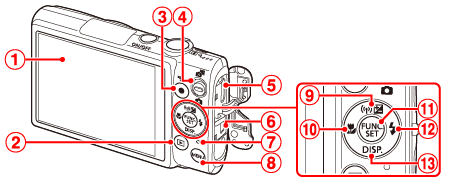 ![]() | < (播放)> 按鈕 | ![]() | < (曝光補償)>/< (Wi-Fi)>/上按鈕 |