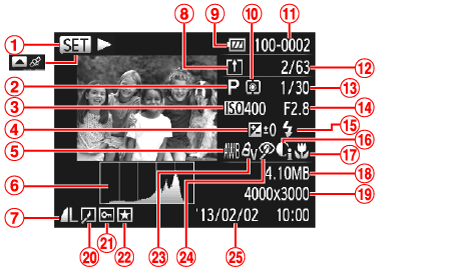 ![]() | 直方圖 | ![]() | 靜止影像︰解像度 短片:播放時間 |