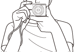 緊握相機兩側,手臂緊靠身體。確保手指不要阻擋 <閃光燈>。