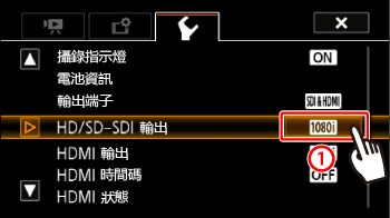從 HD/SD-SDI 端子輸出的數碼信號包括視頻信號、音頻信號和時間代碼信號。必要時,執行以下步驟可以將輸出變更為高清或標清。