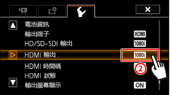 自動],視乎外部顯示器的功能而定視乎外部顯示器的功能而定,輸出信號將自動切換為高清或標清。在 CAMERA 模式中,錄影模式設定為 28 Mbps LPCM (59.94P/50.00P) 或 24 Mbps LPCM 時,HDMI OUT 端子會輸出取樣頻率為 48 kHz 的雙聲道線性 PCM 音頻。1. 選擇輸出端子。