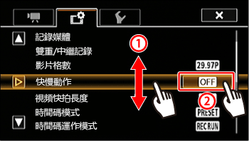 記錄 MP4 影片時,攝錄機可使用與播放影片格數不同的影片格數 (拍攝影片格數) 進行記錄。使用比播放影片格數更快的拍攝影片格數記錄 (快速記錄) 時,會生成慢動作效果。相反,使用較低的影片格數則會產生快鏡動作效果 (慢速記錄)。此模式下不會記錄聲音。