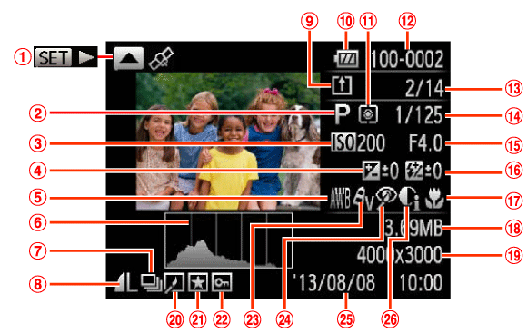 ![]() | 資料夾編號 – 檔案編號 | ![]() | 拍攝日期/時間 |