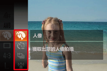 ![]() | 拍攝人像 | [人像] ( ) | 以柔和的效果拍攝人物照。 | |
