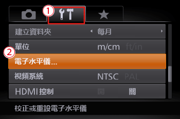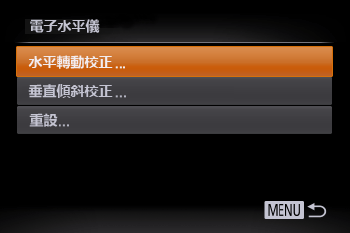 - 如果步驟 1 中沒有顯示電子水平儀,請按 <MENU> 按鈕 (