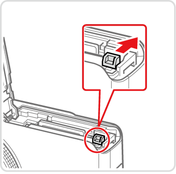開啟蓋子並沿箭頭方向按壓電池鎖。