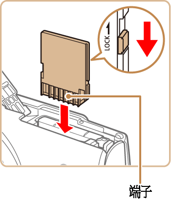 - 確保以正確方向插入記憶卡。以錯誤方向插入記憶卡可能會損壞相機。