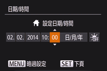 如果開啟相機時顯示 [日期/時間] 螢幕,請按照以下步驟準確設定當前日期及時間。按照以上方法指定的資訊會在您拍攝時記錄至影像內容,適用於根據拍攝日期整理影像或打印顯示日期的影像。您亦可按需要加入拍攝日期標記。