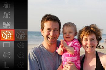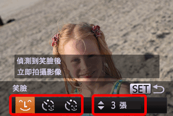 | •主體面向相機並咧嘴露齒笑時,相機會更容易偵測到笑臉。 •也可以透過按快門按鈕如常進行拍攝。 •拍攝完成後,應切換至其他模式,否則相機會繼續在偵測到笑臉時拍攝。 •如要更改拍攝張數,按 或 按鈕前請先在步驟 1 中選擇 。[眨眼偵測] 只會在最後一次拍攝時使用。 | ||