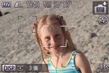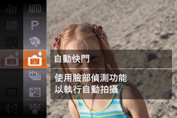 | 偵測到笑臉後自動拍攝 [笑臉] ![]() | 即使沒有按快門按鈕,相機偵測到笑臉後亦會自動進行拍攝。 | 1.選擇拍攝模式後,相機進入拍攝待機模式,並會顯示 [正在偵測笑臉]。 2.將相機對準人物。 - 每次相機偵測到笑臉, 都將在指示燈亮起後進行拍攝。 - 要暫停笑臉偵測,按 按鈕。再次按 按鈕恢復偵測。 |