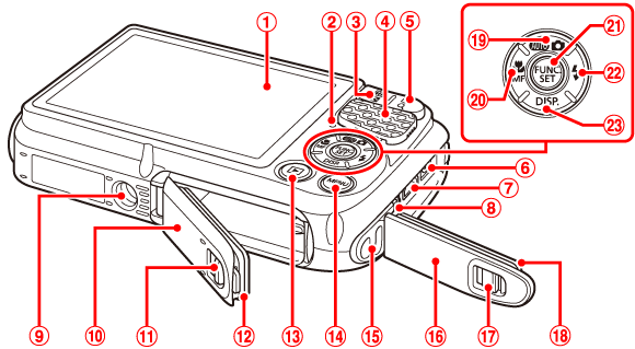 ![]() | 三腳架插孔 | ![]() | FUNC./SET 按鈕 |