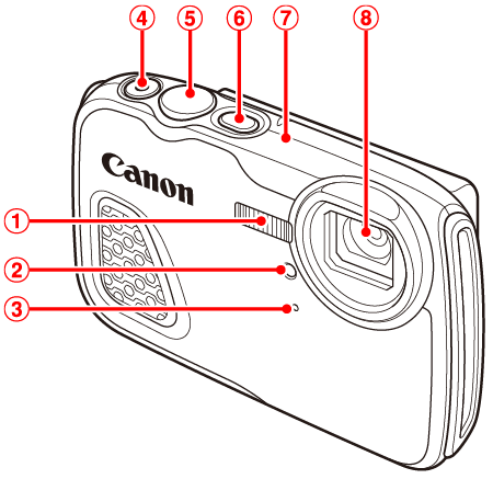 ![]() | 變焦按鈕 拍攝:< (遠攝)>播放:< (放大) | ![]() | 端子蓋鎖 |