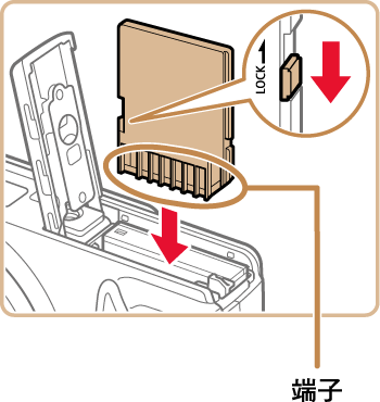 3. 檢查記憶卡的寫保護片並插入記憶卡。