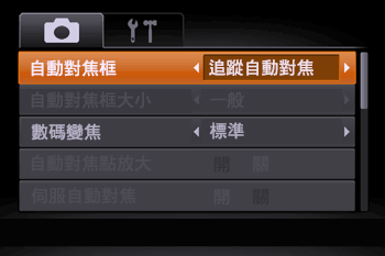 ) 設定頁上的 [自動對焦框],然後選擇 [追蹤自動對焦]。