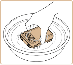 - 清洗相機後,請使用乾燥的軟布將其完全擦拭乾淨。清洗並擦乾相機後,請確保在執行按下或打開、關閉操作時,相機上的所有按鈕和蓋子均可正常使用。