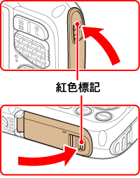 沿著箭頭方向放下記憶卡/電池蓋鎖和端子蓋鎖,然後按住它們直到其喀噠一聲鎖定到位。確保這些鎖返回到圖中所示的位置,紅色標記不再可見。