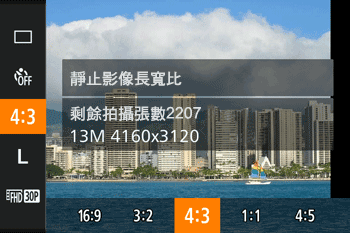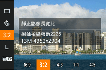按照如下所示變更影像的長寬比 (寬度對於高度的比例)。即使將長寬比從 3:2 切換為 4:3 (多個長寬比),也可以繼續以相同的焦距拍攝。