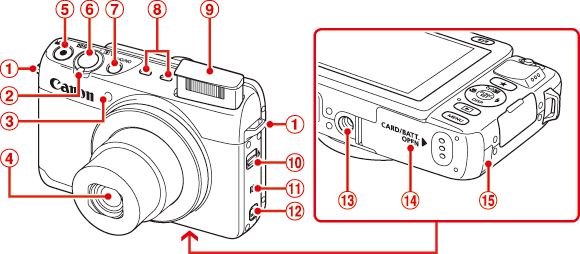 ![]() | 快門按鈕 | ![]() | 記憶卡/電池蓋/Wi-Fi 天線區域 |