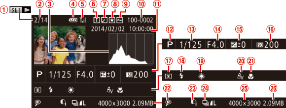 ![]() | 目前的影像編號/影像總數 | ![]() | 曝光補償等級、曝光偏移等級 |