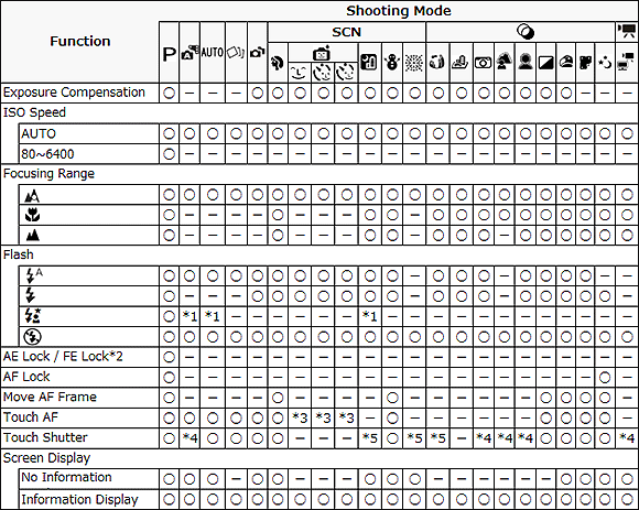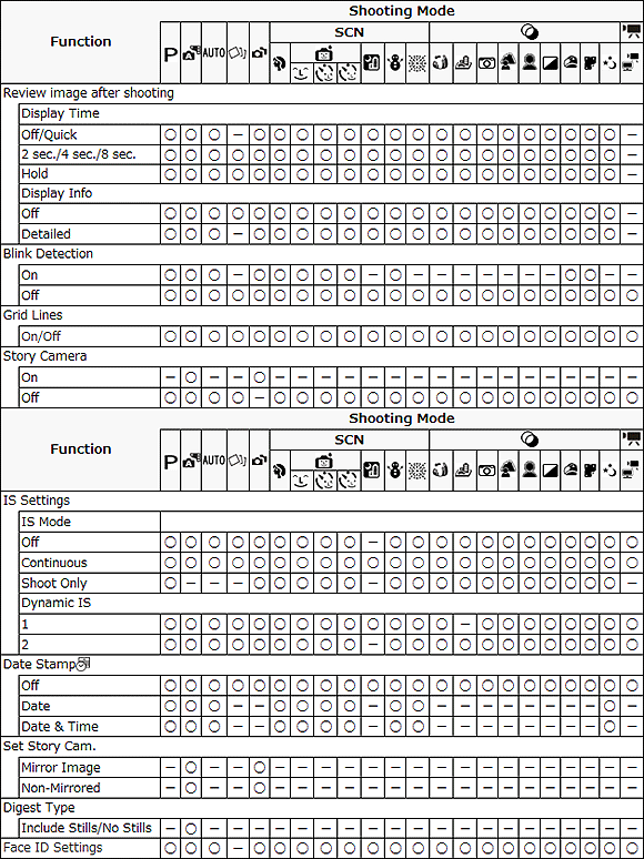 :不可用)- 各拍攝模式中的可用功能