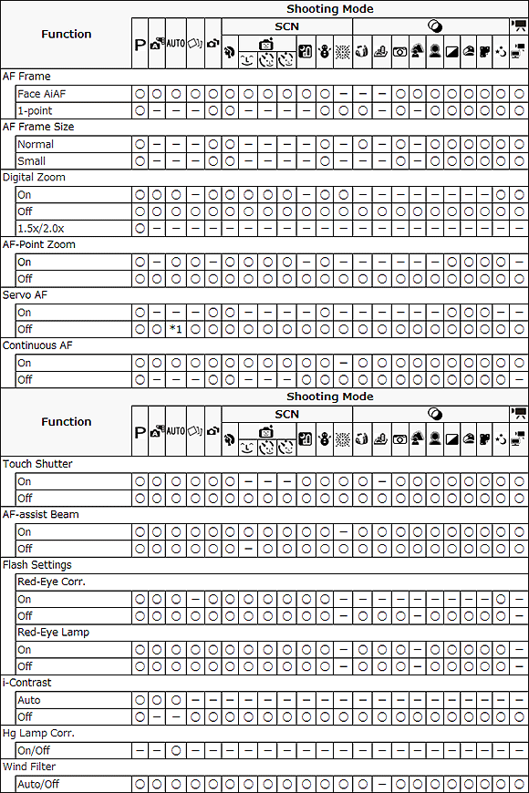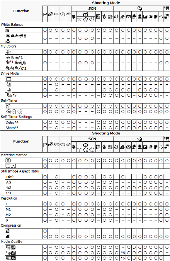 如果無法設定某些拍攝功能,請檢查當前的相機拍攝模式。有些拍攝功能可能無法在某些拍攝模式下使用。關於可以使用的拍攝功能和拍攝模式搭配,請參閱以下清單。
