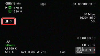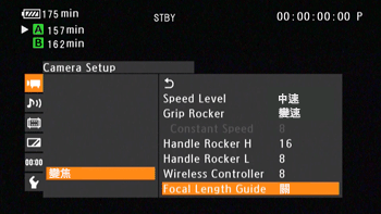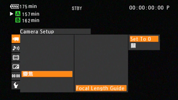 使用兩台攝錄機進行 3D 記錄時,焦距指南將作為輔助。此指南顯示為數值,並包含 195 級的範圍。可以在變焦範圍內的任意點將該指南設定為 0,以協助精確校準兩台攝錄機。