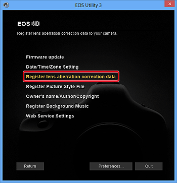 使用 EOS Utility Ver.3.x 時,您可以在相機中註冊鏡頭像差校正資料或將註冊的資料從相機中刪除。