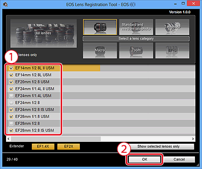 在相機中註冊的鏡頭的編號/可註冊的鏡頭的編號6. 出現僅顯示所選鏡頭種類的清單。