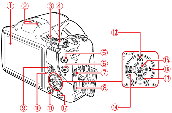 ![]() | AV OUT (音頻/視頻輸出)/DIGITAL 端子 | ![]() | (閃光燈模式)/右按鈕 |