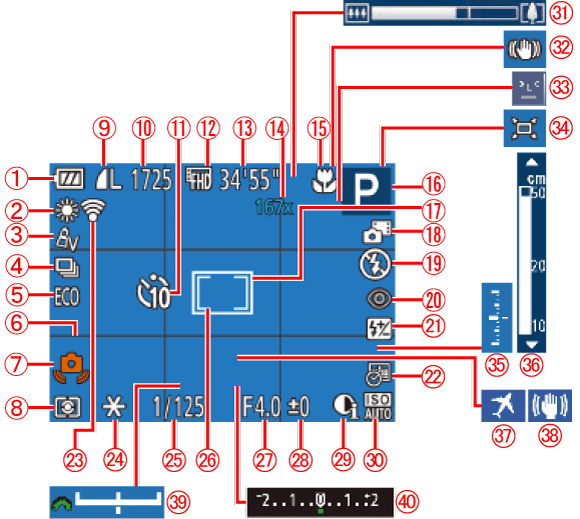 ![]() | 拍攝模式、場景圖示 | ![]() | 手動對焦指示器 |
