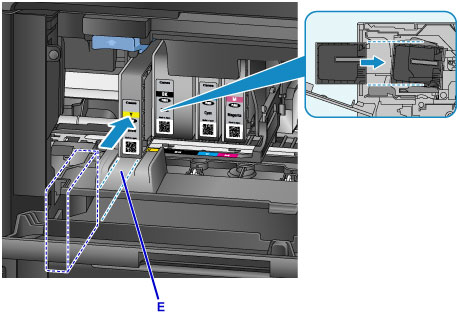 4. 插入新墨水盒時使其與本機的安裝導紙器 (E) 對齊。