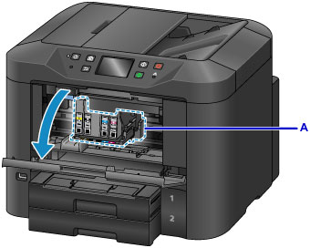 可更換墨水盒顯示於觸摸螢幕且列印頭固定座 (A) 移至墨水盒更換位置。