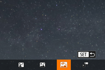 星星划過天空的軌跡會記錄在一張影像上。確定快門速度和拍攝張數後,相機將連續拍攝。一個拍攝過程可持續最多大約兩小時。請先檢查電池電量。