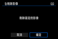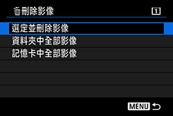 :刪除影像] 設定為 [資料夾中全部影像] 或 [記憶卡中全部影像] 時,將刪除資料夾或記憶卡中的所有影像。