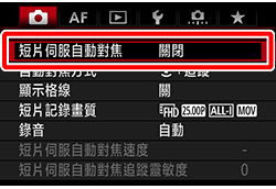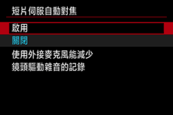 >。 - 如果要連續對焦某一點或不想讓鏡頭操作雜音被記錄下來,可以按如下方法暫停短片伺服自動對焦。停止短片伺服自動對焦時,自動對焦點將變為灰色。執行如下相同步驟時,將恢復短片伺服自動對焦。