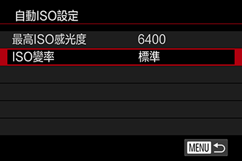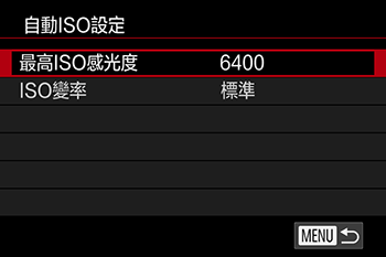 此外,選擇 [ISO自動] 後,可設定最大 ISO 感光度或選擇變更比。