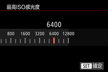 5] 設定頁 > [ISO感光度] > [ISO感光度]。當相機設定到 [AUTO] 時,可以在 [400] – [12800] 的範圍內指定最高 ISO 感光度,且可以在三級的範圍內指定靈敏度。