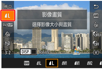 ] 按鈕變更 [JPEG],選擇所需的儲存解像度和壓縮度。選擇 [–],相機將僅儲存 RAW 檔案。