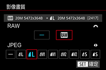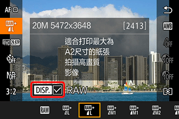 要一起儲存 JPEG 及 RAW 檔案,選擇 JPEG,然後按 [DISP.] 按鈕為 [RAW] 添加 [