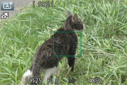 - 半按快門按鈕。相機會在對焦後發出兩下嗶聲,並在已對焦的影像範圍上顯示自動對焦框。