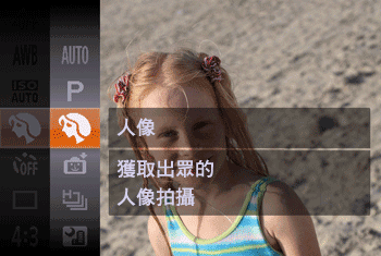 ] 按鈕選擇所需拍攝模式。(以下範例螢幕影像中已選擇 [人像] (