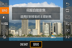 - 如安裝名稱中帶有「STM」的鏡頭,請開啟伺服自動對焦,持續調整對焦,並進行連續拍攝。使用此功能會降低連續拍攝的速度。如在連續拍攝期間進行變焦,對焦可能會丟失。