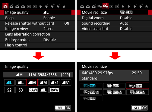 8. 選擇靜止影像的影像記錄畫質或短片的短片記錄大小。