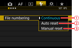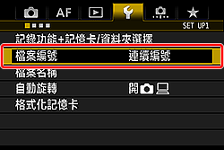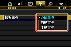 | 手動重設檔案編號至 0001 或在新資料夾中從 0001 開始檔案編號。 | 手動重設檔案編號時,會自動建立一個新資料夾,儲存至此資料夾的影像的檔案編號會從 0001 開始。例如,您想將前一天拍攝的影像及當天拍攝的影像儲存至不同的資料夾時,此功能非常方便。 | 手動重設後,檔案編號方法會回復連續編號或自動重設。(不會出現手動重設確認畫面。) |