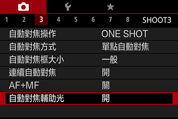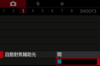 *在某些拍攝模式下無法將 [自動對焦輔助光] 設定為 [關]。有關可將 [自動對焦輔助光] 設定為 [關] 的拍攝模式清單,請參閱本頁末尾的表格。以下是停用自動對焦輔助光的步驟。