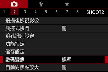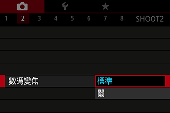 - 要停用數碼變焦,按 <MENU> 按鈕,在 [拍攝] 設定頁 (