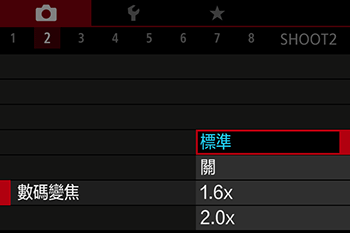 ] 按鈕設定 [數碼變焦] 為 [1.6x] 或 [2.0x] ,然後按 [