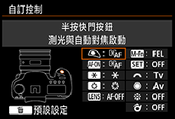 如果在相機的自訂功能 (C-Fn) 設定中,為 [快門/自動曝光鎖按鈕] 指定了預設 [自動對焦/自動曝光鎖] 以外的功能,則自動對焦無法使用。因此,即使半按快門按鈕,對焦確認燈在某些設定下還是不會亮起。